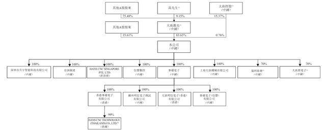 在香港上市前,高云峰通过大族激光、大族控股,分别持股83.63%、0.76%,合计持股84.39%,其他A股股东持股15.61%。其中,大族激光由大族控股、高云峰、其他A股股东分别持有15.37%、9.15%、75.48%。